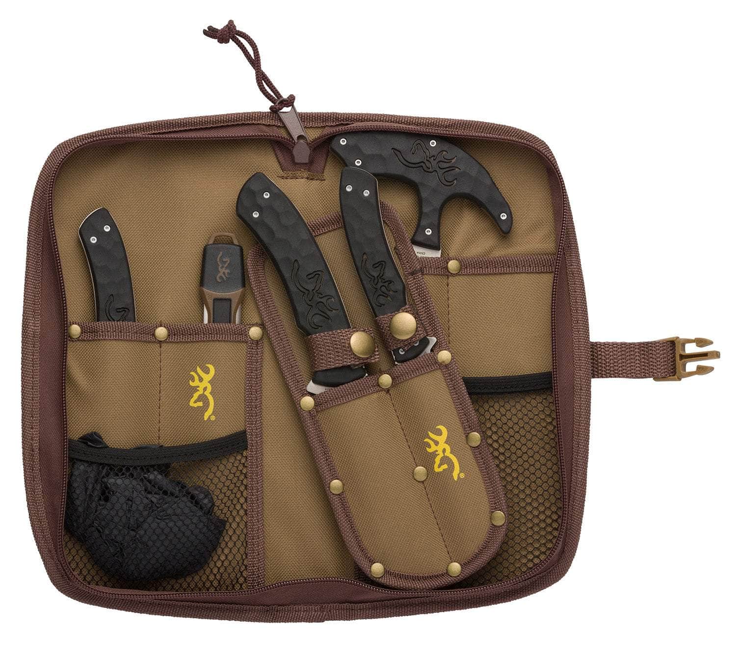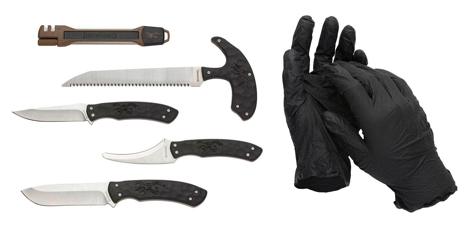 Browning 3220422B Primal Combo Fixed Bone Saw/Caper/Gut Tool/Sharpening Tool/Skinner 8Cr13MoV SS Blade, Black Polymer w/Rubber Overmold Handle, 6 Piece Set, Includes Case/Gloves