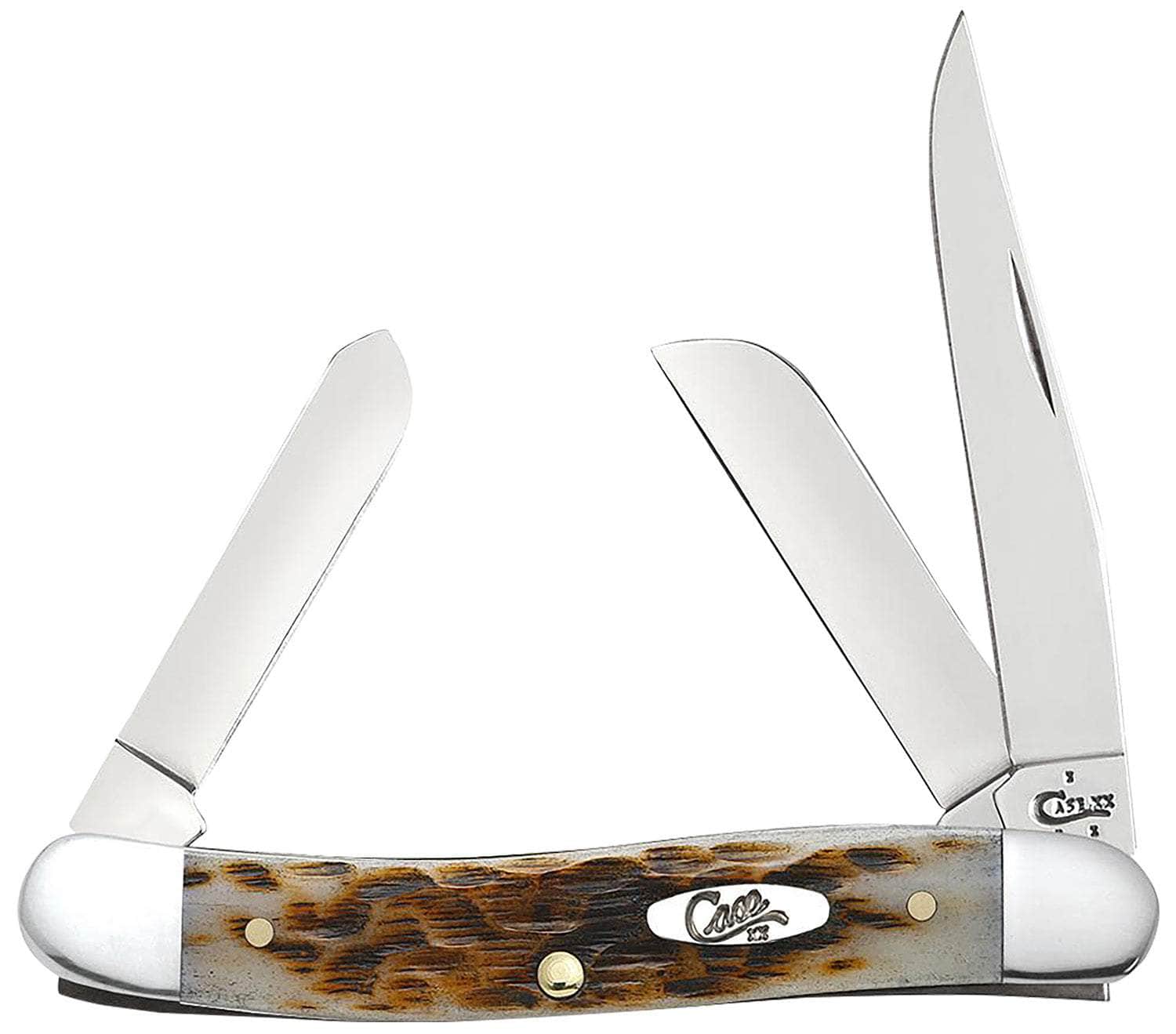 Case 00042 Stockman Medium 2.57"/1.88"/1.71" Folding Clip Point/Sheepsfoot/Spey Plain Mirror Polished Tru-Sharp SS Blade Peach Seed Jigged Amber Bone Handle