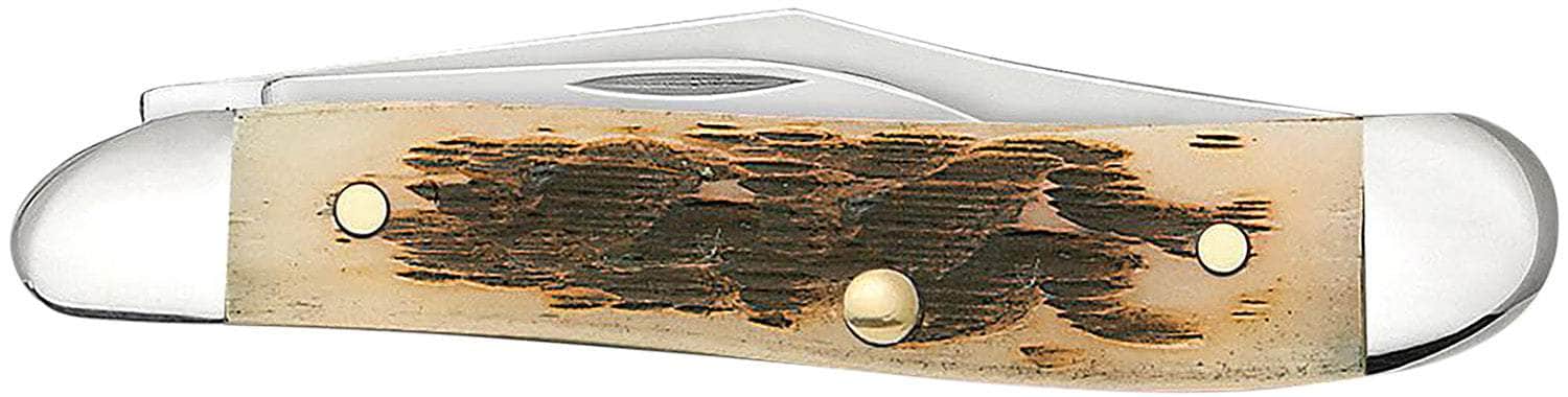 Case 00045 Peanut 2.10"/1.53" Folding Clip Point/Pen Plain Mirror Polished Tru-Sharp SS Blade, Peach Seed Jigged Amber Jigged Bone Handle