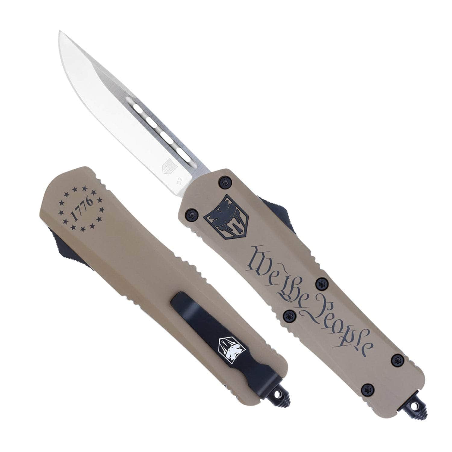 CobraTec Knives MWTPFS3DNS FS-3 We The People Medium 3" OTF Drop Point Plain D2 Steel Blade Tan w/"We The People" Aluminum Cerakoted Handle Features Glass Breaker Includes Pocket Clip