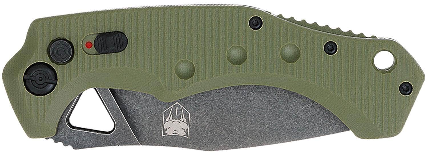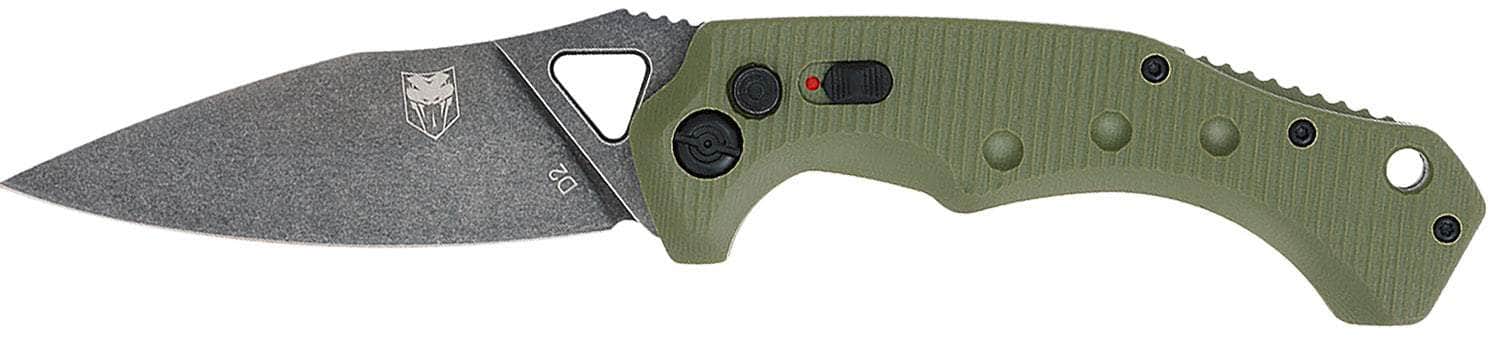 The Ryker is a side button folding automatic knife designed for robust functionality and durability. Featuring G-10 scales, it offers a secure grip even in challenging conditions. The blade, made from black stonewash D2 steel, ensures exceptional edge retention and resistance to wear. Equipped with a right-hand pocket clip for convenient carry, the Ryker also includes a sliding safety switch to prevent accidental discharge, adding an extra layer of safety and control. Ideal for everyday use or tactical situations, the Ryker combines reliability with practical design for versatile performance.