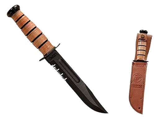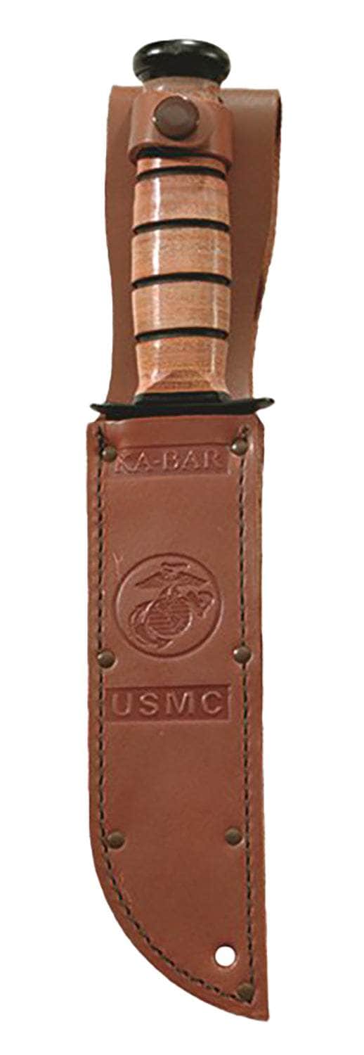 Ka-Bar 1218 USMC Fight/Utility 7" Fixed Clip Point Part Serrated Black 1095 Cro-Van Blade. Brown Leather Handle. Includes Sheath