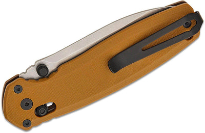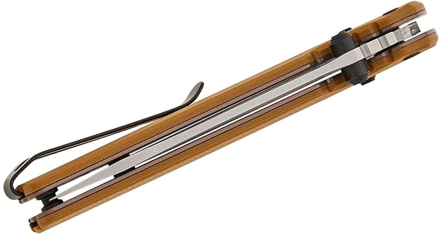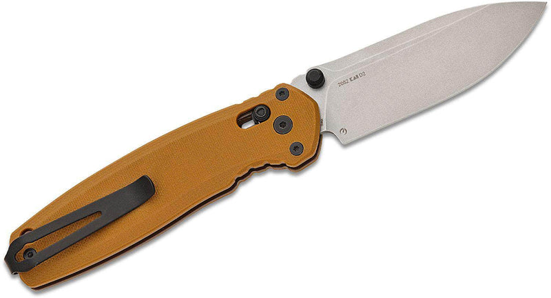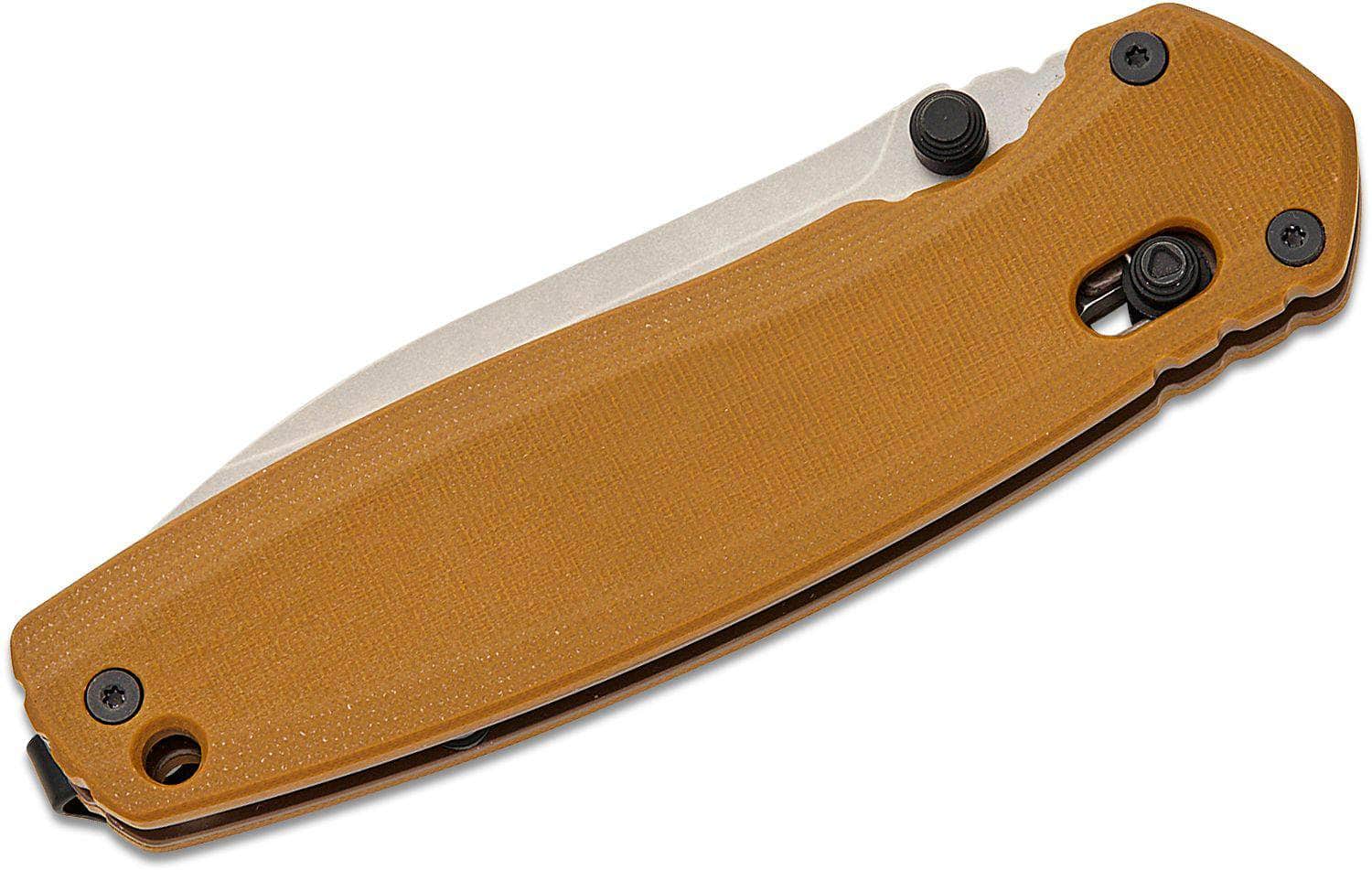 As its name implies, the Broadside is a versatile cutting tool on the job. The spear point blade features D2 blade steel and a saber grind for greater versatility. A tan G10 handle fills the hand comfortably, offering a firm grip for extended work. Activate with the thumb stud for reliable and smooth KVT deployment. Ultra-secure DuraLock technology locks the blade in place. Slide back the handle button to safely close the blade and carry the Broadside with a reversible deep-carry pocket clip. Whether you work in a trade or tackle home projects, the beefy Broadside will not let you down.