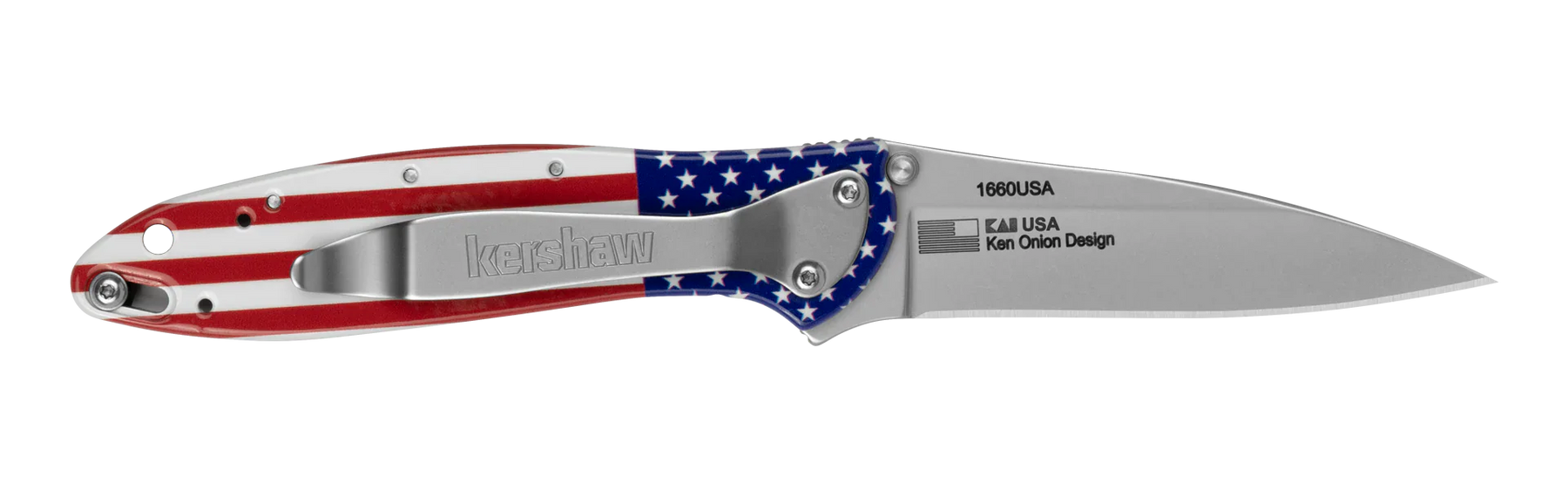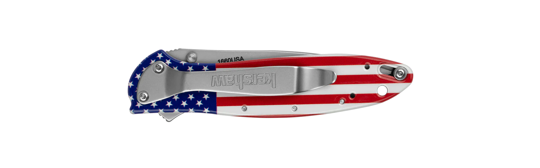 Celebrate the American spirit with a proud and patriotic Leek. Manufactured in the USA, this Kershaw displays a custom handle image of the Stars and Stripes. Activate the American folder easily with assisted opening and a flipper. The slim design and sharp blade make it perfect for everyday carry. When closed, slide the tip lock up to safely secure the blade. Carry the red, white, and blue on your next adventure with the Leek USA Flag.