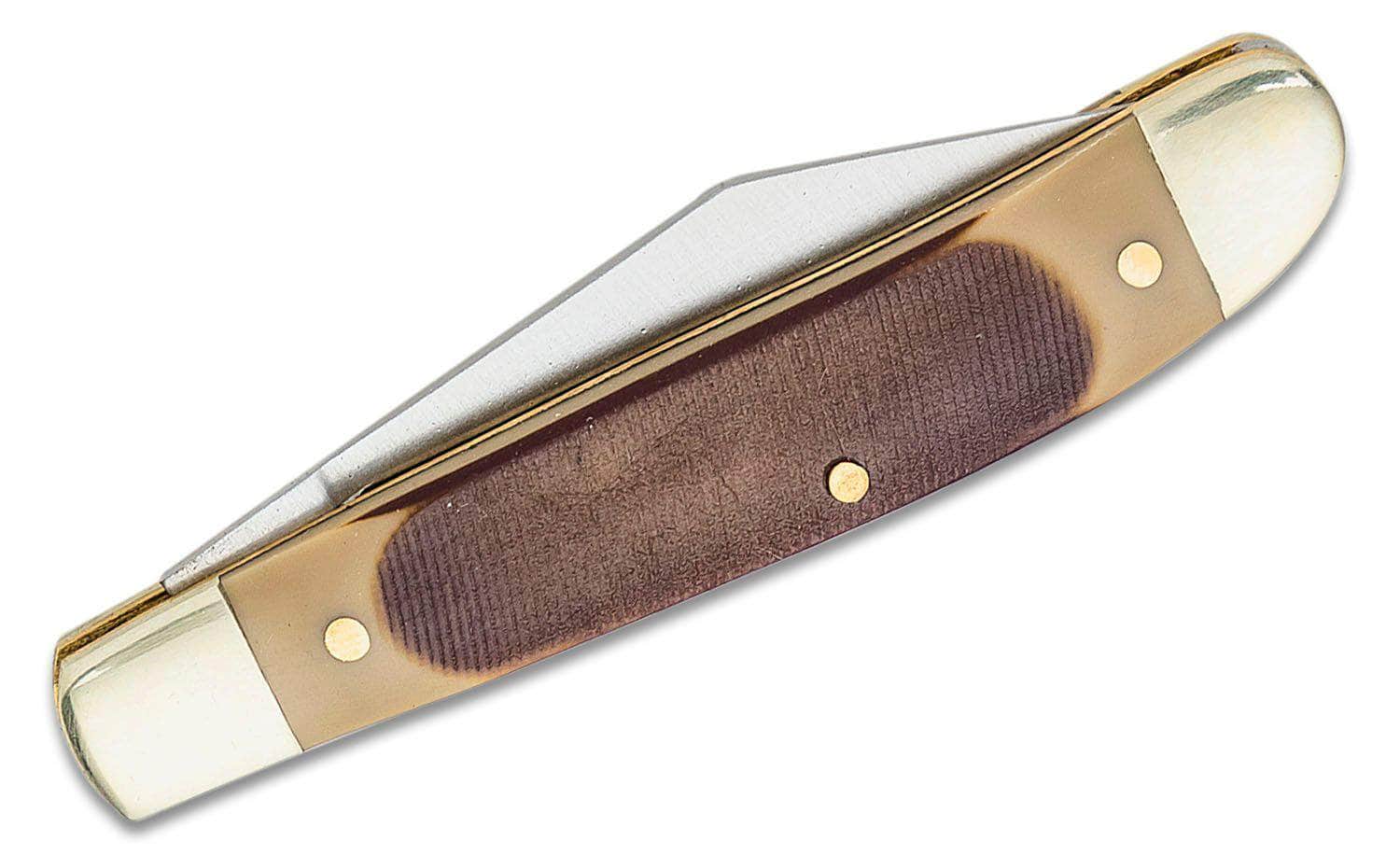 The 12OT is one of Old Timer's quintissenal knives. This small slipjoint features a handy clip point blade made of high carbon stainless steel and an extremely comfortable handle made of brown Delrin with a sawcut pattern. On either end of the handle, nickel silver bolsters provide a stunning contrast from the Delrin, offering additional sturdiness and a an old-school aesthetic. If you're looking for a great compact pocket knife that won't break the bank, look no further than Old Timer.