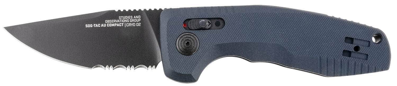 S.O.G SOG-15-38-08 SOG-TAC Auto Compact 2.94" Folding Straight Back Part Serrated Black TiNi Cryo D2 Steel Blade Black Micro-Textured Anodized Aluminum Handle Includes Pocket Clip