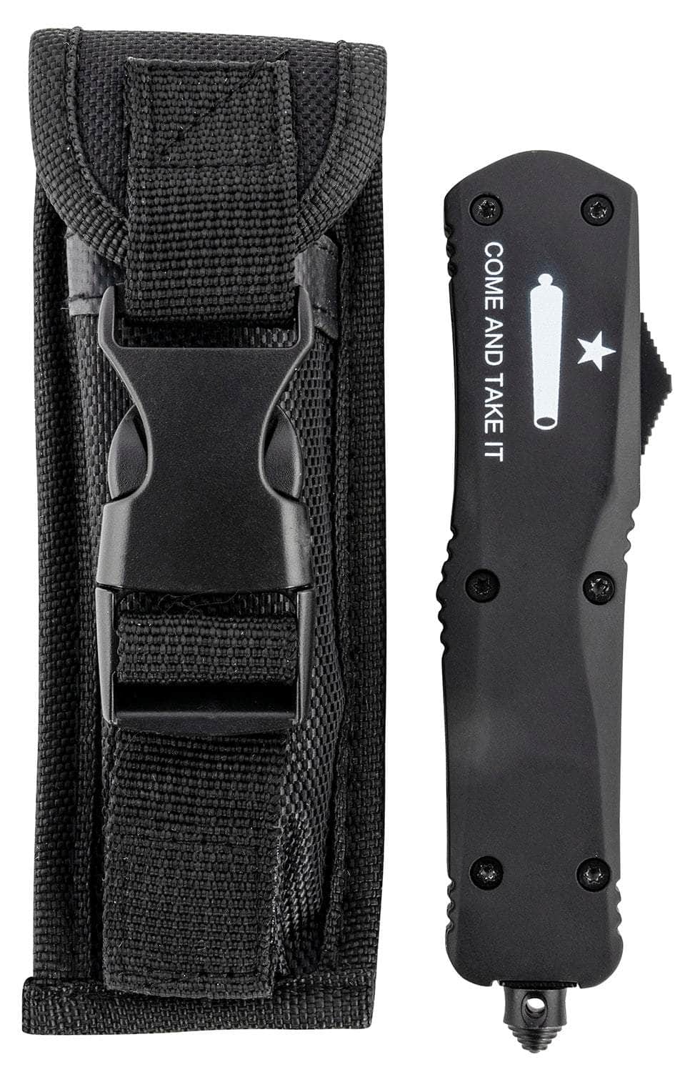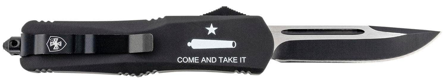 Templar Knife LCATI331 Gen II Come And Take It Large 3.50" OTF Drop Point Plain Black Oxide Stonewashed 440C SS Blade, 5.25" Black "Come And Take It" Aluminum Handle, Glass Breaker