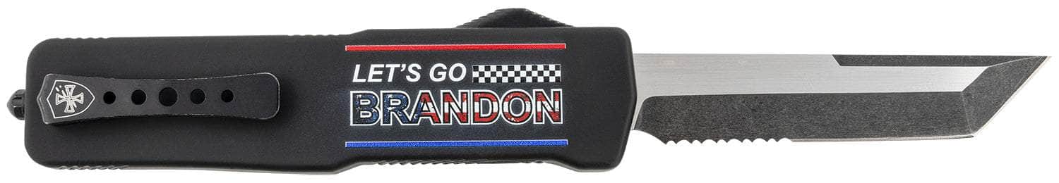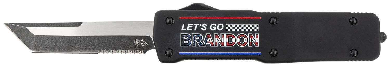 Templar Knife LZLGB521 Premium Weighted Let's Go Brandon Large 3.55" OTF Tanto Part Serrated Black Oxide Stonewashed D2 Steel Blade, 5.25" Black "Lets Go Brandon" Aluminum Zinc Alloy Handle