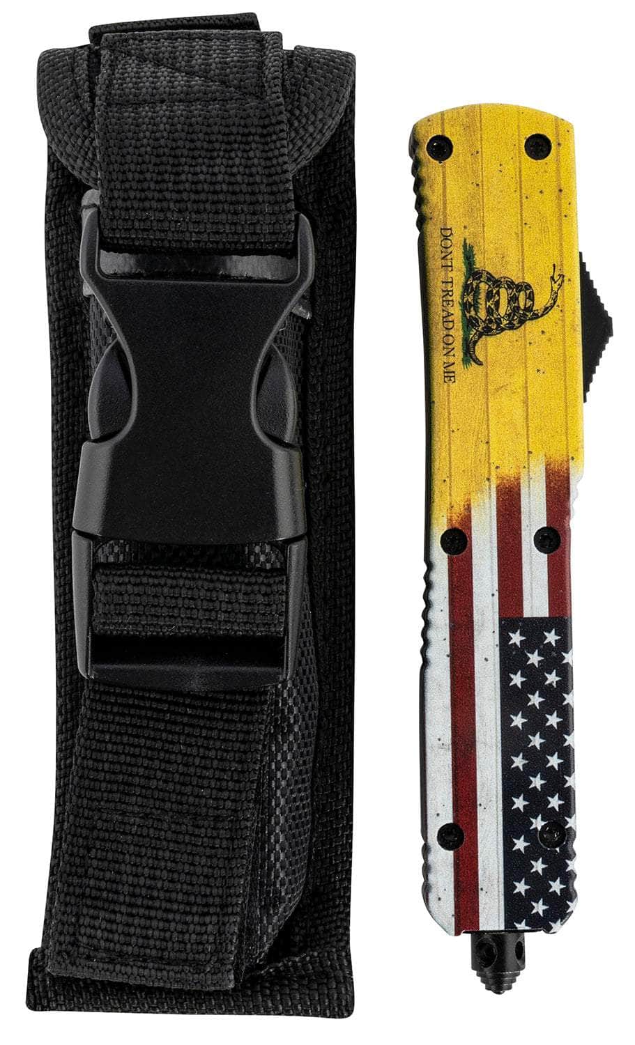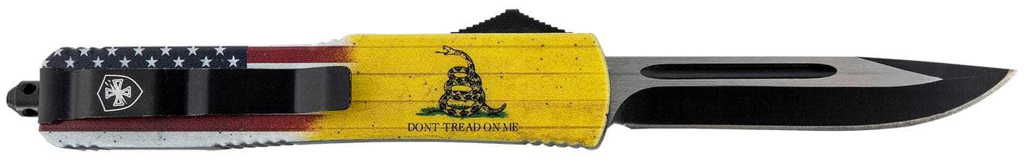Templar Knife MDTOM331 Gen II Don't Tread On Me Slim 3.50" OTF Drop Point Plain Black Oxide Stonewashed 440C SS Blade, 5.05" Yellow w/Flag & "Don't Tread On Me" Aluminum Handle, Glass Breaker