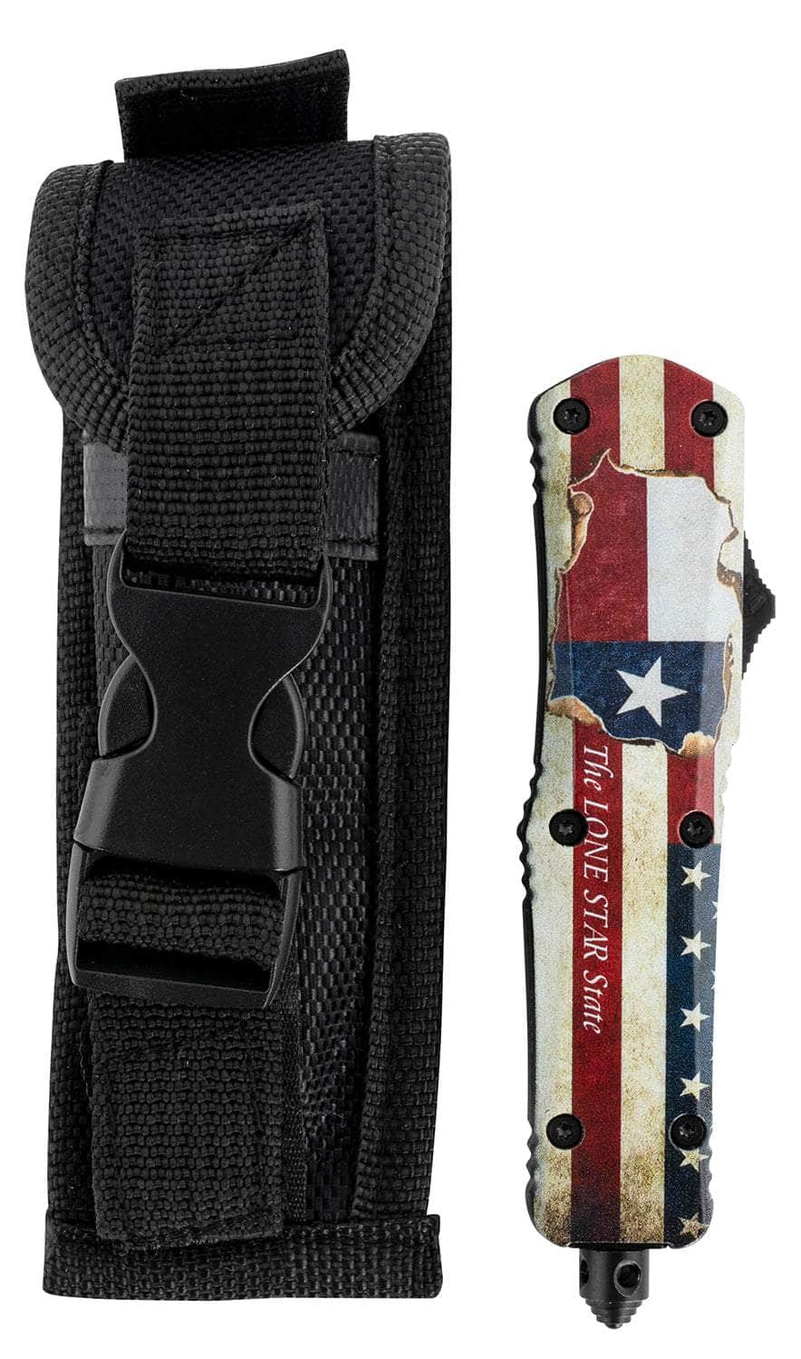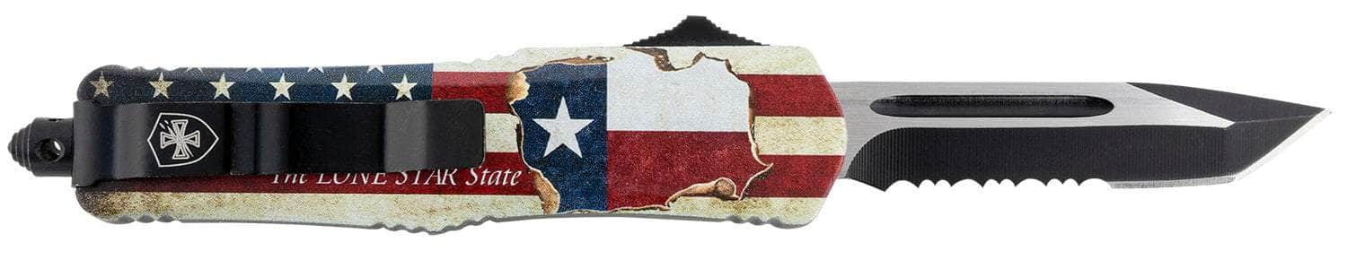 Templar Knife STX531 Gen II Texan Small 2.25" OTF Tanto Part Serrated Black Oxide Stonewashed 440C SS Blade, 4.31" Texas Flag Aluminum Handle, Glass Breaker