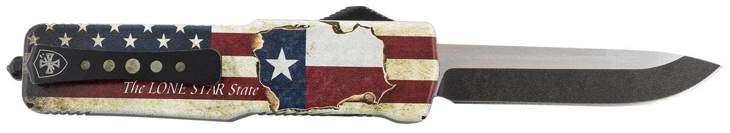 Templar Knife SZTX321 Premium Weighted Texan Small 3" OTF Drop Point Plain Black Oxide Stonewashed D2 Steel Blade, 4.50" Red/White/Blue w/"The LONE STAR State" Aluminum Zinc Alloy Handle