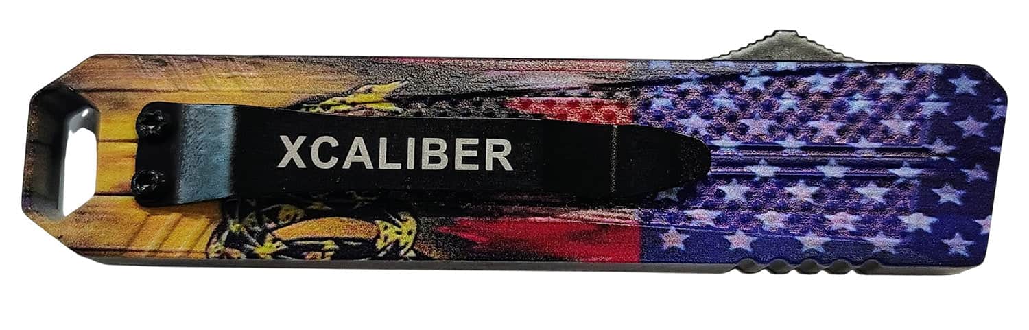 Xcaliber Knife Company Don't Tread on Me Small 2.75" OTF Drop Point Plain Black 440C SS Blade, 4.15" US Flag Aluminum Handle